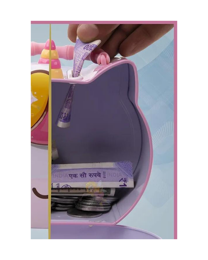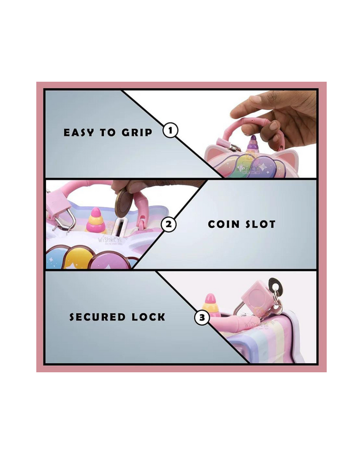 La alcancía es muy fácil de usar. Simplemente inserta el dinero que te sobre a través del orificio que se encuentra en la parte superior de la alcancía y ¡no te preocupes! Las monedas se acumulan dentro del adorable gato y puedes obtenerlas fácilmente cuando quieras (desde que tengas la llave).