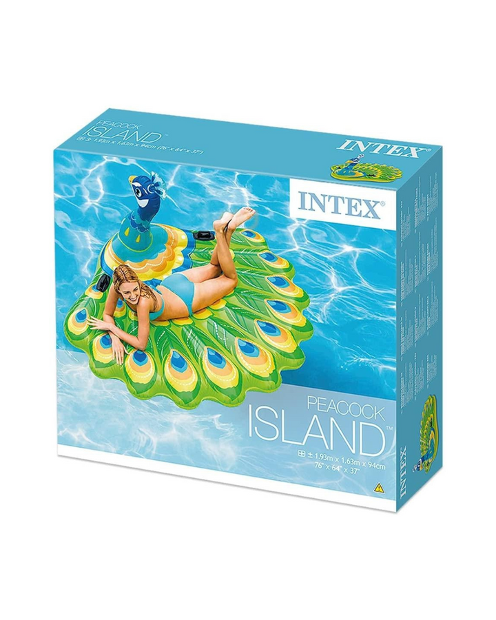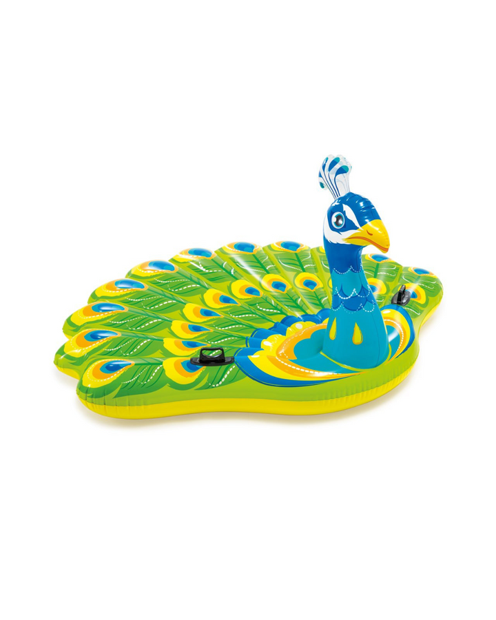 Colchoneta inflable con forma de pavo real Intex que incluye 3 cámaras de aire para aumentar la seguridad de flotación y 2 asas de sujeción soldadas a la lona para mayor comodidad en su uso.