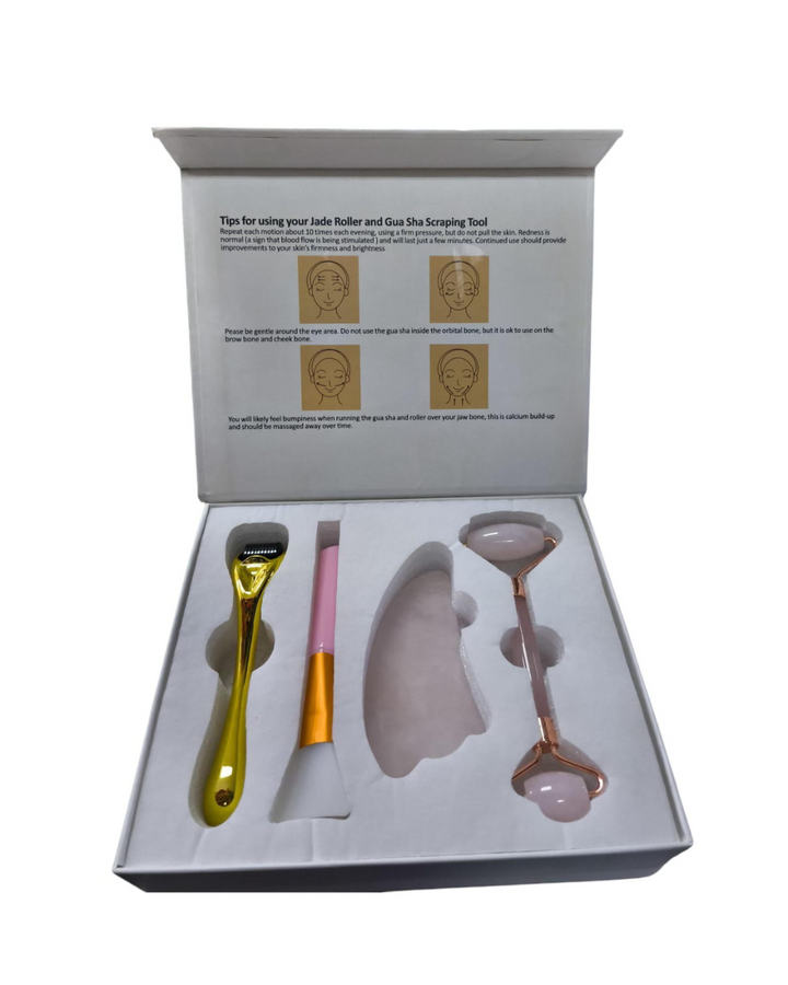 ¿Que incluye? 1 x roller doble de cuarzo, 1 x gua sha cuarzo, 1 x espátula para mascarilla, 1 x dermarroller, caja de empaque.