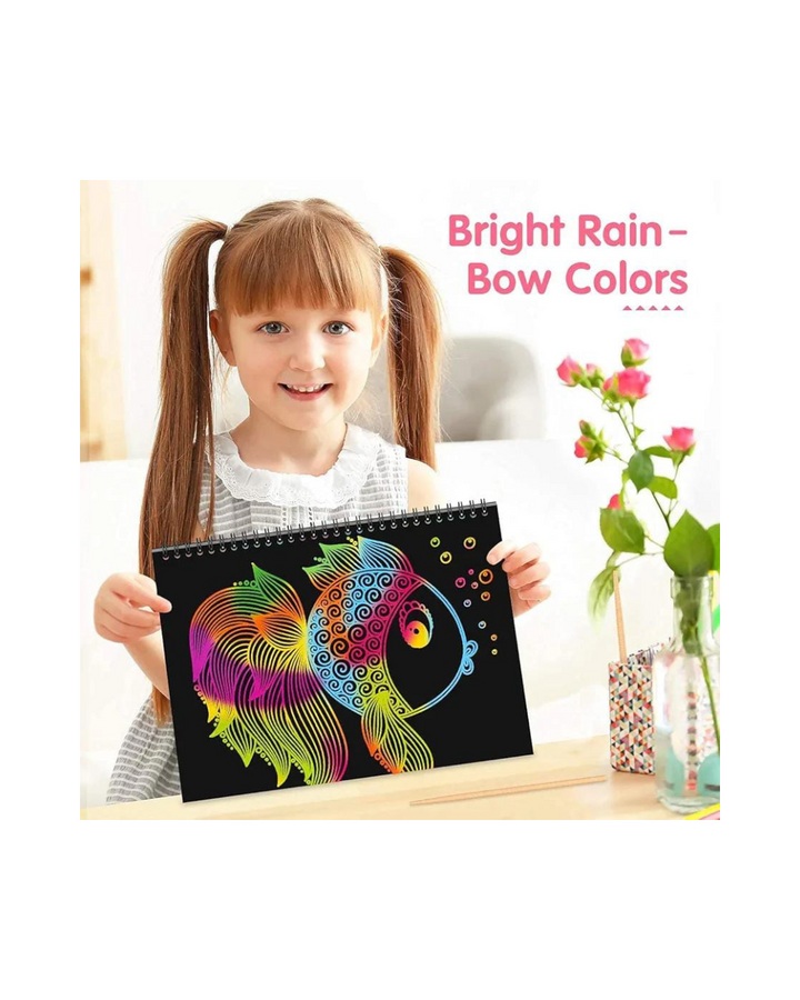 Fácil de crear: deje que sus hijos den rienda suelta a su imaginación y creen obras de arte coloridas con esta libreta para raspar; es fácil de usar, simplemente raspe la superficie negra con el bolígrafo incluido y revele los colores brillantes debajo.
