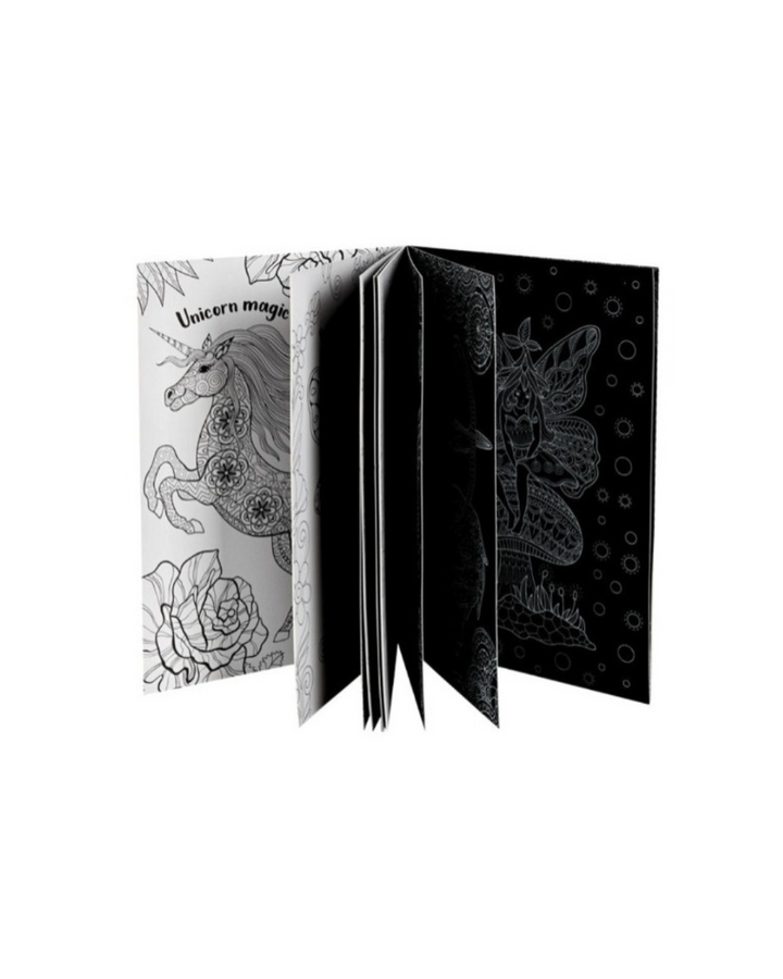 Deje que sus hijos den rienda suelta a su imaginación y creen obras de arte coloridas; es fácil de usar, simplemente raspe la superficie negra con el bolígrafo incluido y revele los colores brillantes debajo.