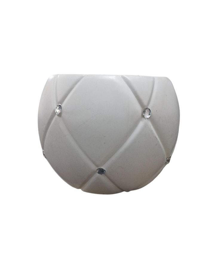 ?Toda la superficie de la maceta está decorada con ranuras en forma de rombo y las intersecciones de las líneas están decoradas con cuentas brillantes que recuerdan a cristales.