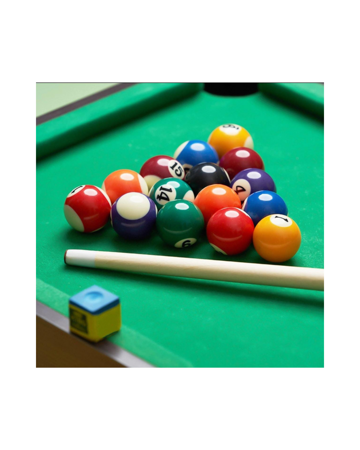 ¿Que incluye? 1 x mesa de billar, 1 x caja x 15 bolas de billar, 1 x bola blanca, 2 x tacos, 1 x triangulo, 1 x tiza, caja e instrucciones.