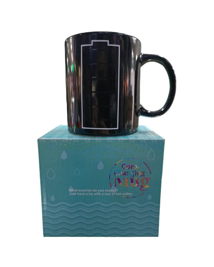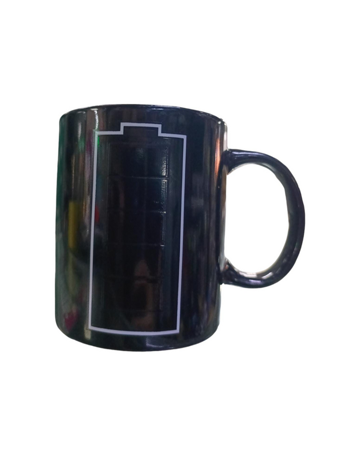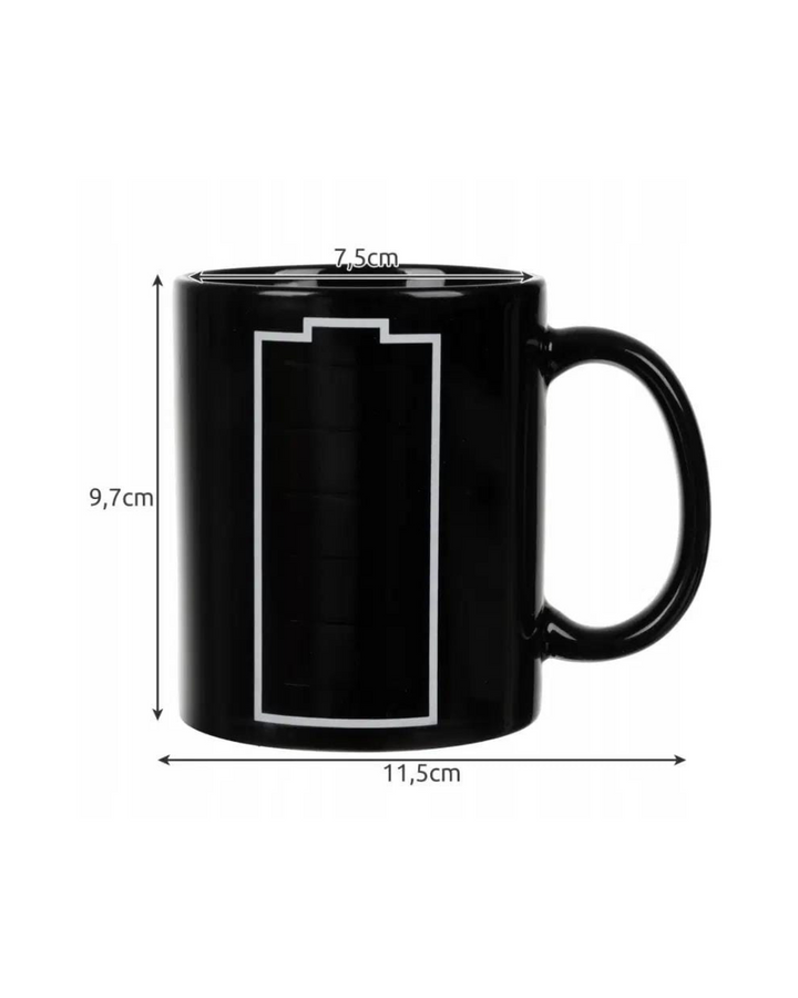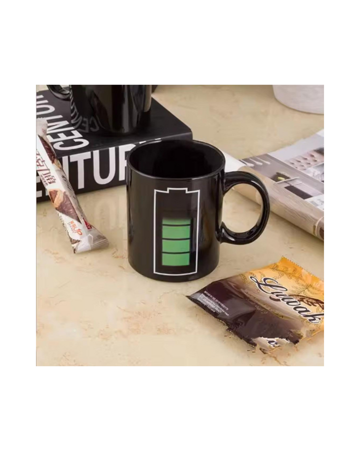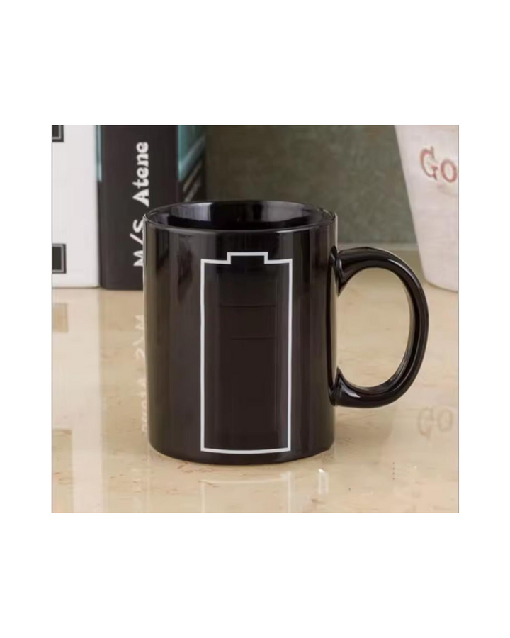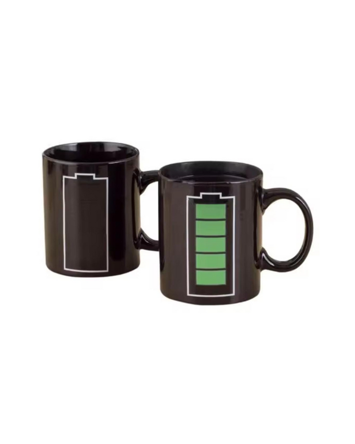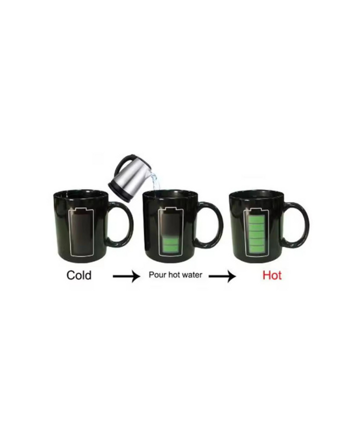 Material Premium gracias a que su material principal es porcelana de alta calidad, siendo de superficie muy duradera y esta elegante taza tiene propiedades mágicas que aparecen al servir una bebida caliente. El símbolo de la batería de la taza se recarga ante sus ojos y cambia de color, indicando cuánta energía queda en la bebida. Apta para el frio y calor, segura para los niños, sin riesgos tóxicos por la pintura ni empaque.