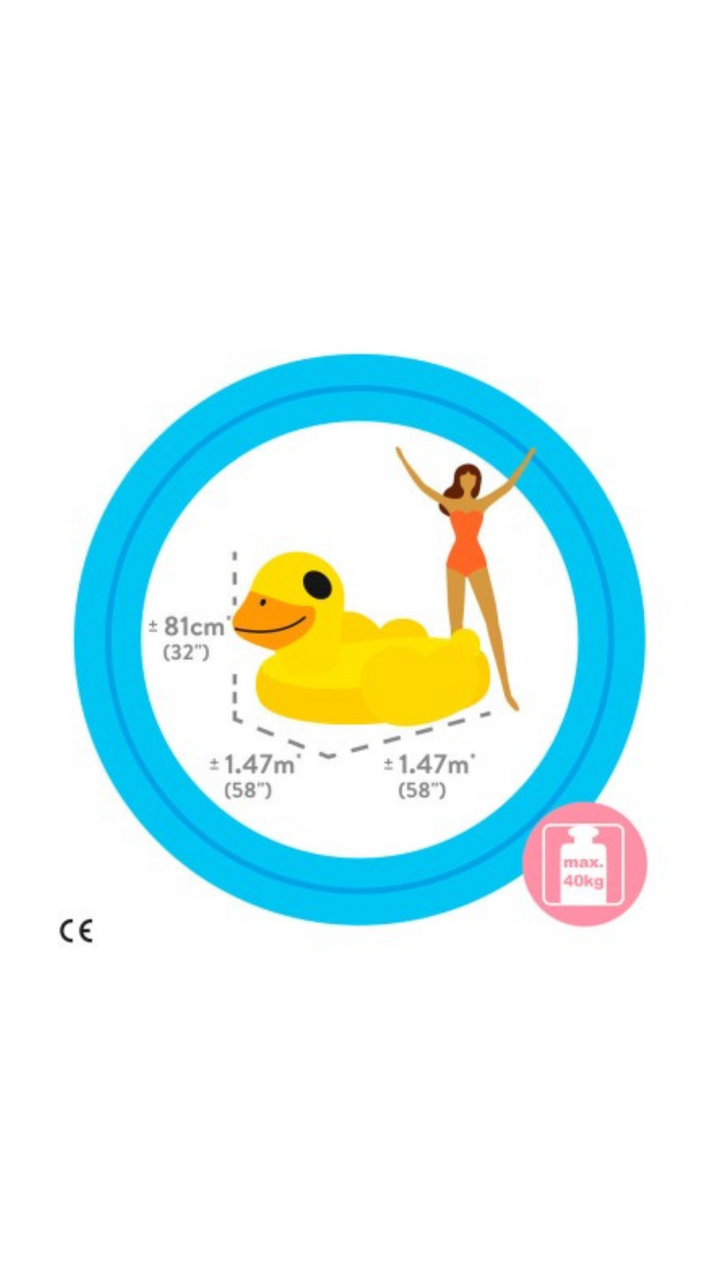 El patito hinchable tiene unas medidas de 147 x 147 x 81 cm y está diseñado para ser utilizado por una persona. Soporta un peso de unos 40 kg y está recomendado para niños a partir de 3 años.