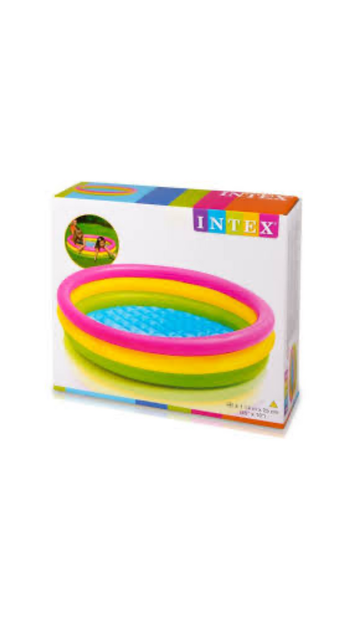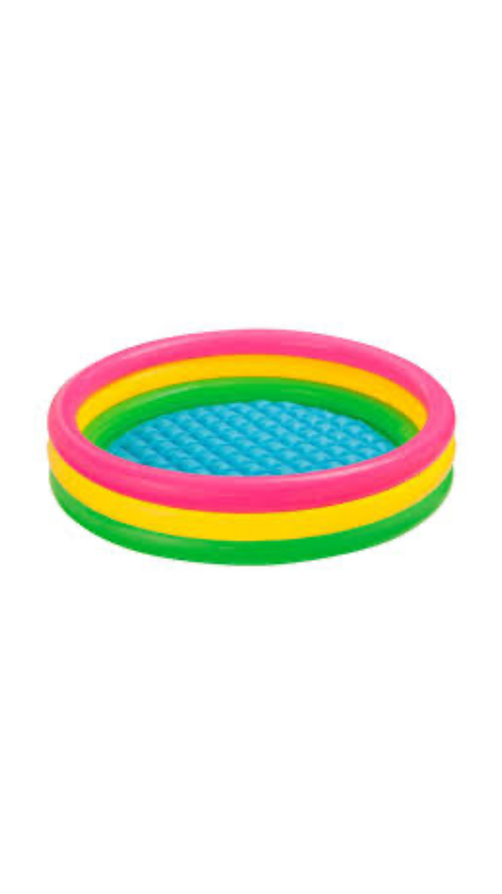 Piscina inflable Intex para niños, Fabricada de Vinilo Resistente, tiene 3 aros de diferentes colores ( Rosado,Verde y Amarillo). El suelo es acolchado para mayor comodidad.