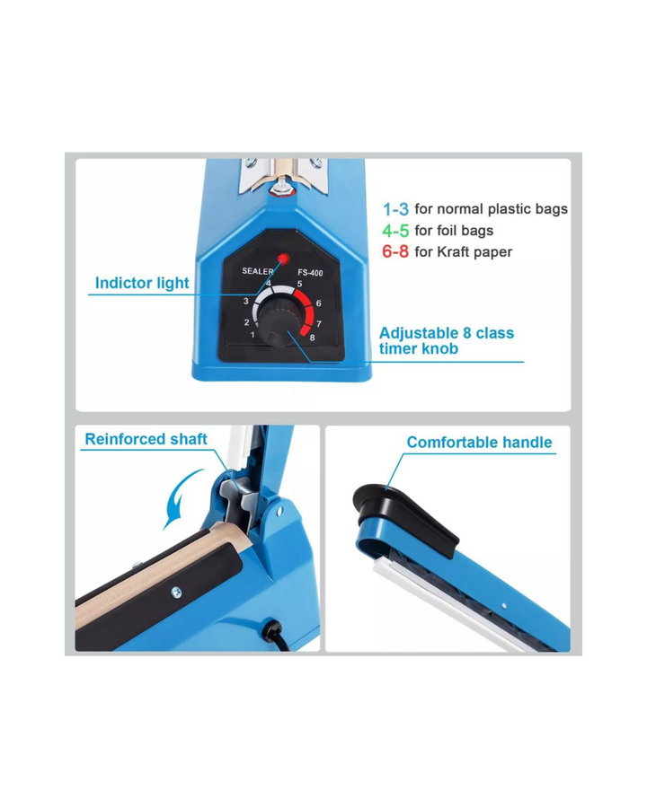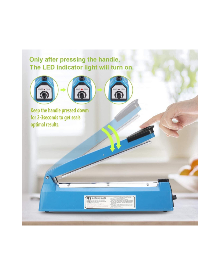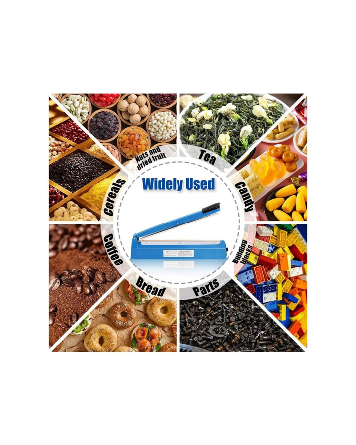 Sirve para sellar diferentes tipos de bolsas, como Kel-F, Mylar, Polyflex, P.V.A., Pliofilm, bolsas de plástico, polietileno, envoltura de burbujas, Tivac, Saran y todas las demás bolsas de material termosellable.