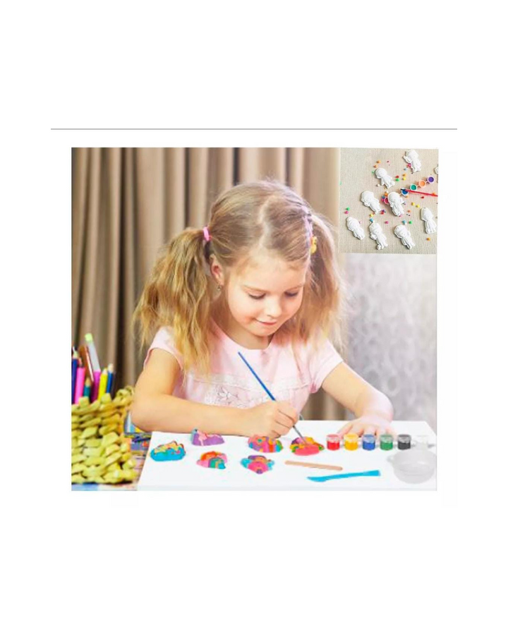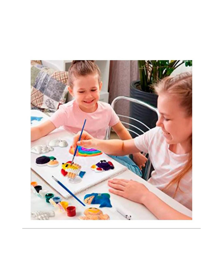 Kit con figuras en yeso que los niños pueden personalizar con las pinturas acrílicas de colores vibrantes que se adhieren fácilmente al yeso, proporcionando horas de diversión artística, estimulando la imaginación, fomentando la expresión creativa y el amor por el arte.