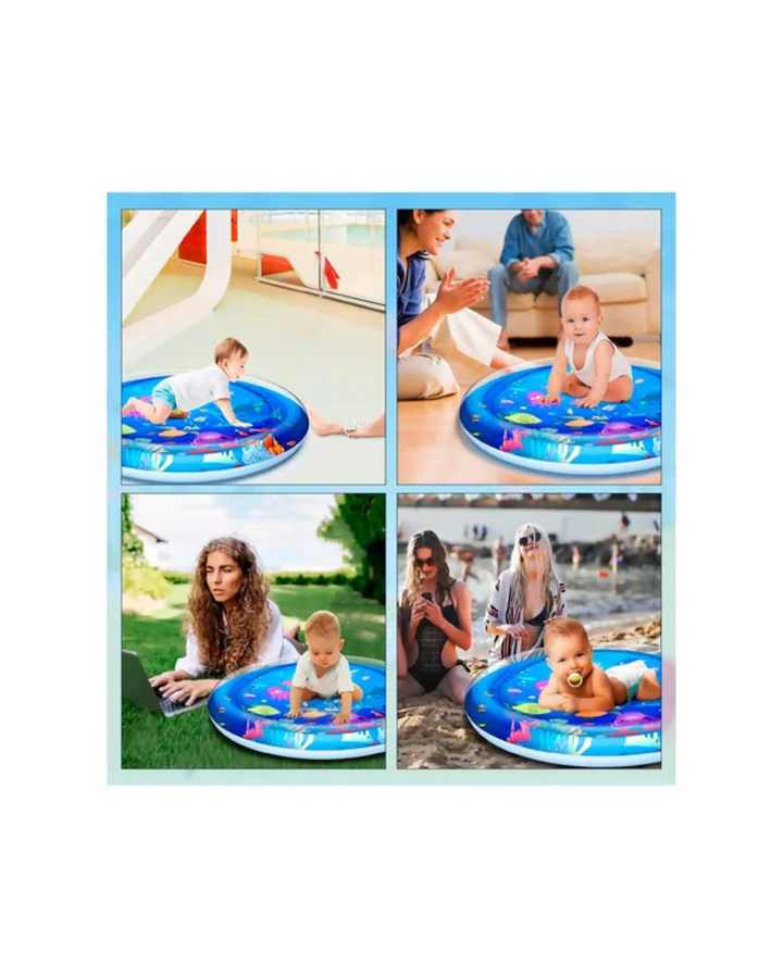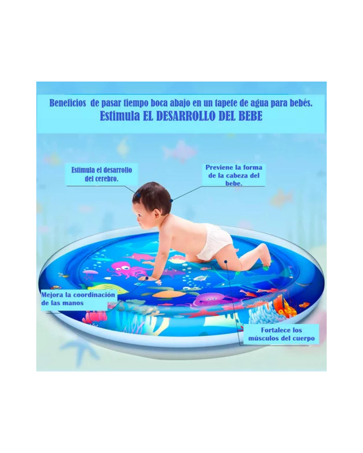 Tapete de agua inflable con agua para bebe, ayuda a la estimulación sensorial, cuando él bebe esta boca abajo estimula las habilidades motoras, cognitivas y cuando presiona la alfombra de agua se mueven los peces promoviendo la coordinación mano.