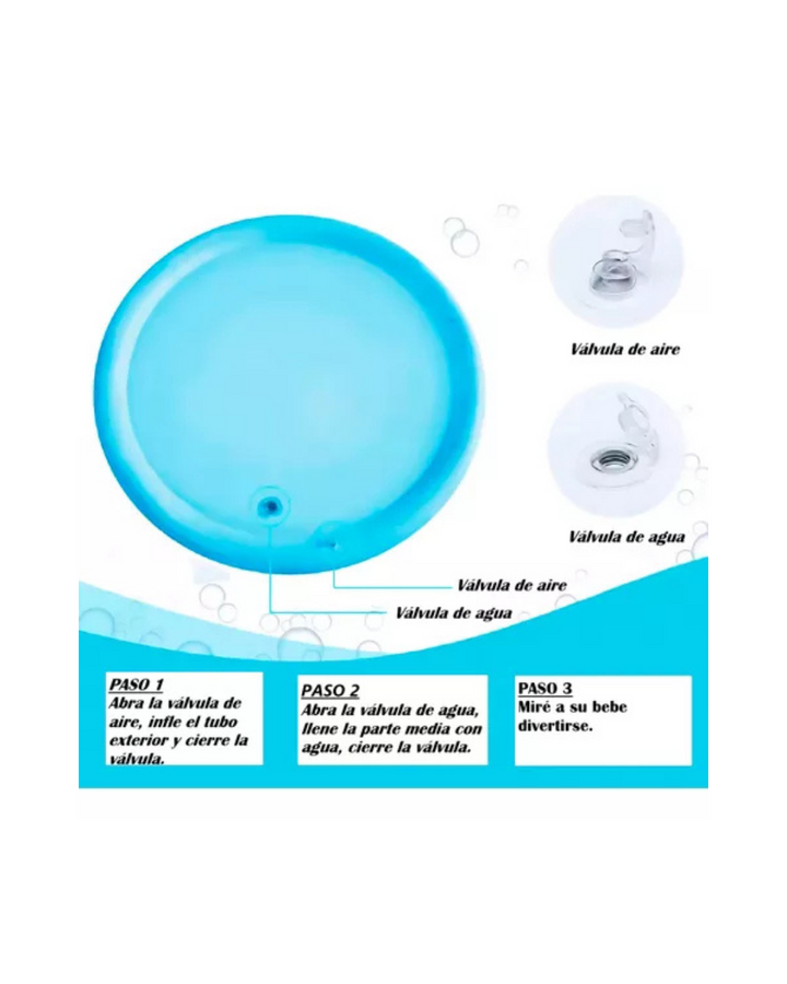 ¿Cómo se usa? Fácil de usar y empaquetar: simplemente infla el anillo exterior y llena la parte interior con agua. Después de usarlo, puedes simplemente vaciar la alfombra, doblarla o enrollarla y guardarla en tu bolso o maleta. También sería un gran regalo para baby shower.